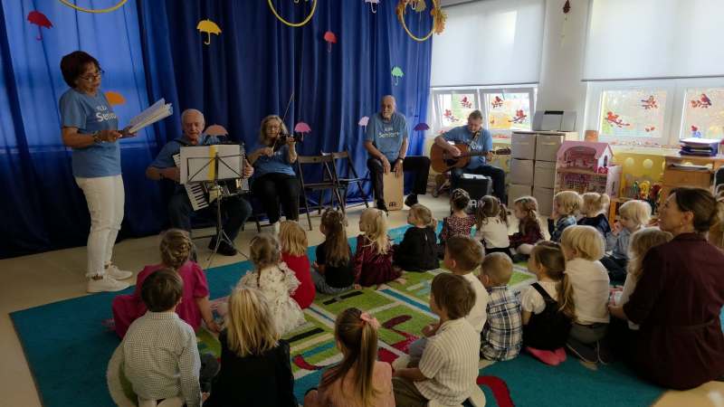 Podczas wydarzenia Pani Jola Staniszewska przedstawiła przedszkolakom muzyków oraz ich instrumenty, po czym rozpoczęła się wspólna zabawa przy muzyce. Seniorzy wykonali popularne dziecięce utwory, m.in. „Mam chusteczkę haftowaną”, „Jedzie pociąg z daleka” oraz „Panie Janie”, które szybko porwały maluchy do wspólnego śpiewu i ruchu.