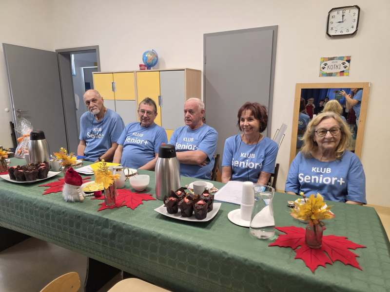 Na zakończenie dzieci otrzymały słodkie upominki oraz ręcznie wykonane zakładki w kształcie kotków, przygotowane przez seniorki z klubu. Dla nauczycielek przekazano słodki poczęstunek oraz jesienny stroik do dekoracji sali. Seniorzy otrzymali pamiątkowy dyplom, wykonano wspólne zdjęcie, a następnie obie grupy spędziły chwilę przy wspólnym stole, regenerując siły po radosnej zabawie.