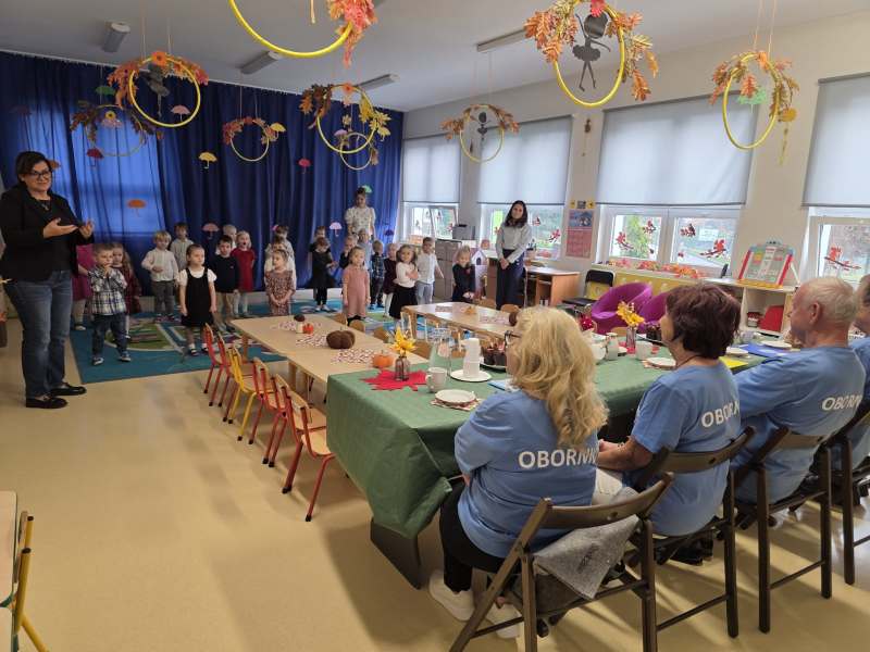 Gości powitała Dyrektor Renata Kijek, wyrażając radość z wizyty i zachęcając do częstszych spotkań. Dzieci przygotowały krótką część artystyczną: recytację wiersza o jesieni oraz piosenkę z kolorowymi parasolkami.
