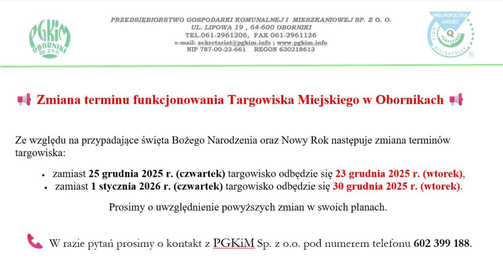 Ze względu na przypadający Nowy Rok następuje zmiana terminów targowiska.